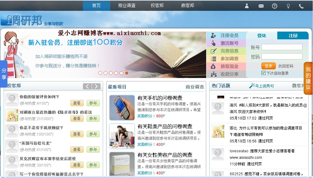 比如爱小志就有【您还有 11 项增值信息没用填写,它们是 爱车一族 手机数码 经理世界 患者健康 医护人员 饮食风暴 妈妈宝宝 游戏玩家 金融理财 旅行相关 网络互联 赶快去完善增值信息可获得更多参与调查的机会!】这11项没有填写,大家最好是填写一下,因为调研邦会根据我们所填写的增值信息,会派发商业问卷到我们的手中,如果您没有填写这些信息,那么就会表示自己对这些不够重视,调研邦也是不会给你派发问卷调查的,当然您收到的问卷调查也是很少的。